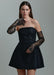 Model je bez naramenica, s odvojenim dugim rukavima od čipke, a blago definirani struk skladno prelazi u kratku A-kroj suknju, stvarajući uravnoteženu i ženstvenu siluetu.